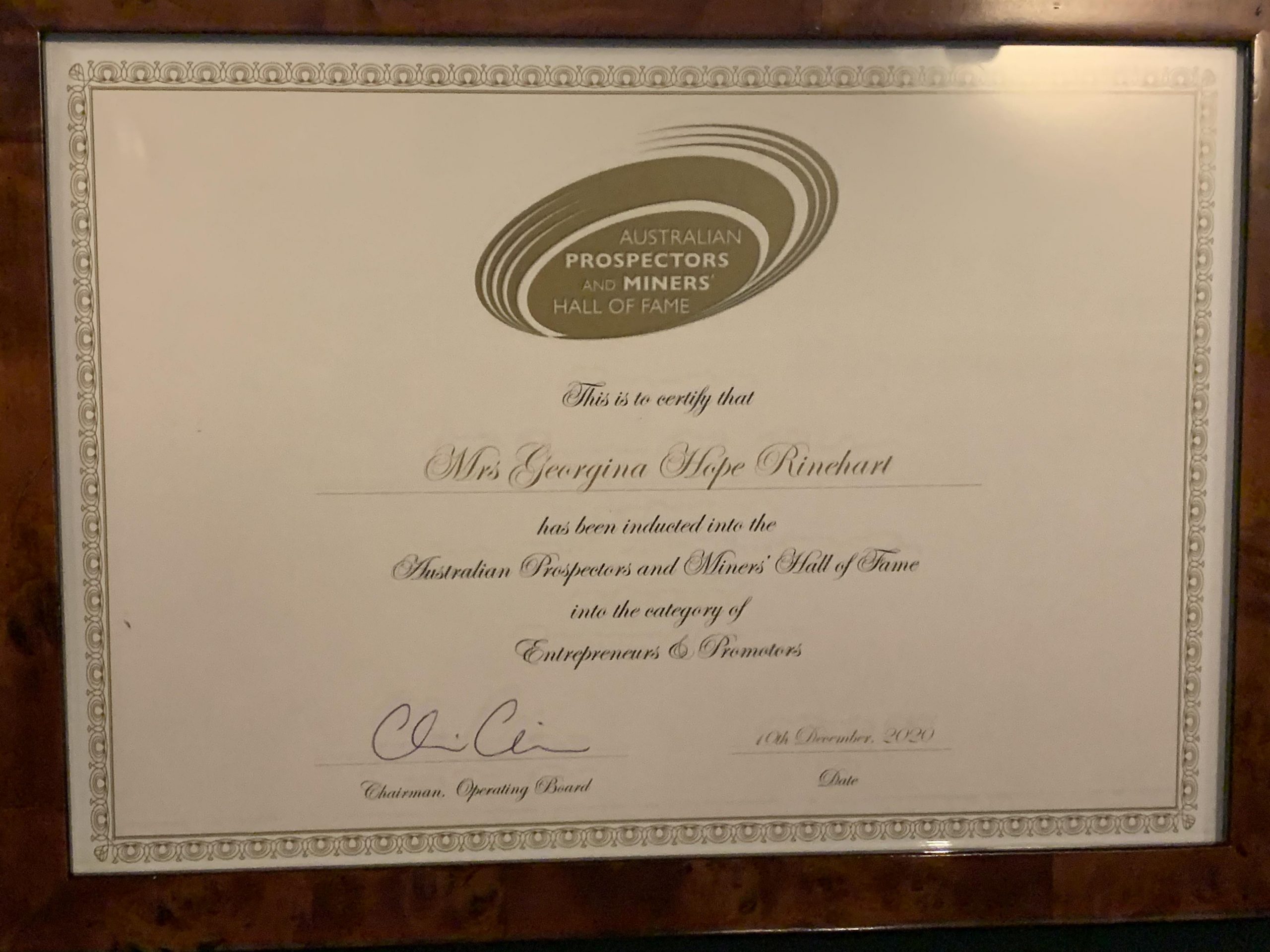 Congratulations to Mrs Rinehart for her induction into the Australian Prospectors & Miners Hall of Fame.