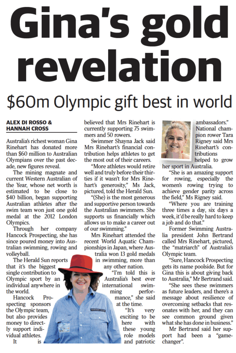 Through her company Hancock Prospecting, she has since poured money into Australian swimming, rowing and volleyball.