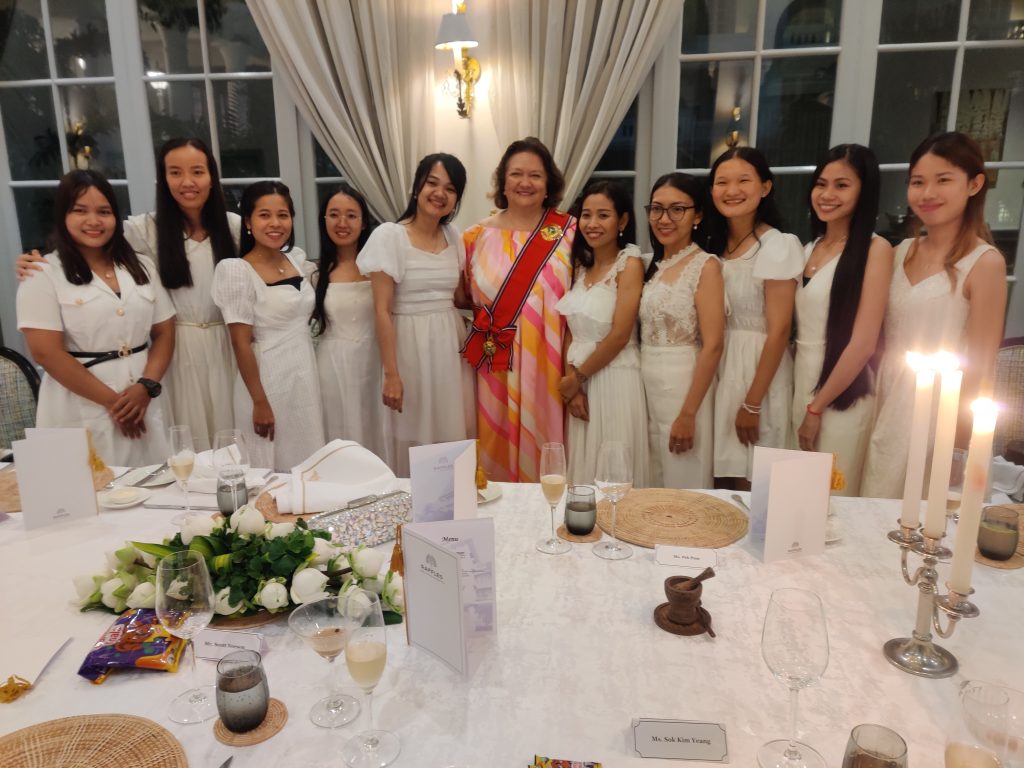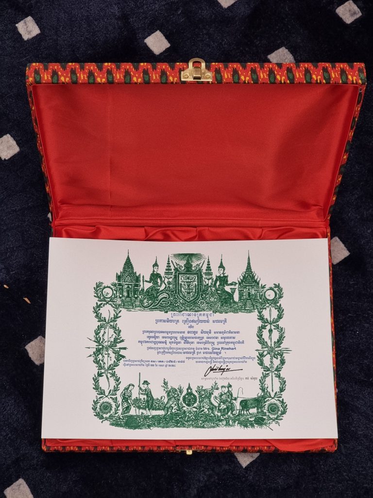 Mrs Rinehart celebrates her award of The Royal Order of Sahametrei from Norodom Sihamoni, King of Cambodia. The Royal Order of Sahametrei (The Grand Cross) is the highest award for non-Cambodians, awarded for Distinguished Services to the King and to the people of Cambodia.