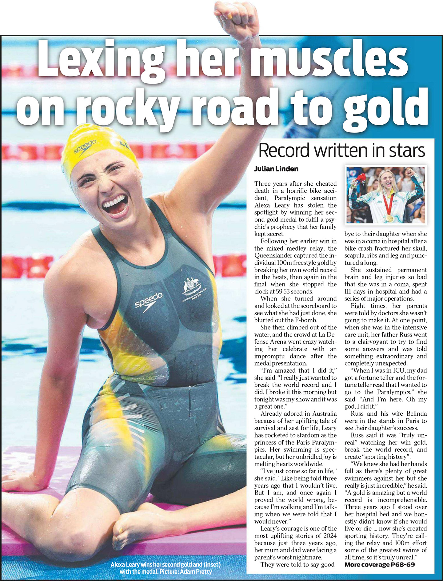 Three years after she cheated death in a horrific bike accident, Paralympic sensation Alexa Leary has stolen the spotlight by winning her second gold medal to fulfil a psychic’s prophecy that her family kept secret.