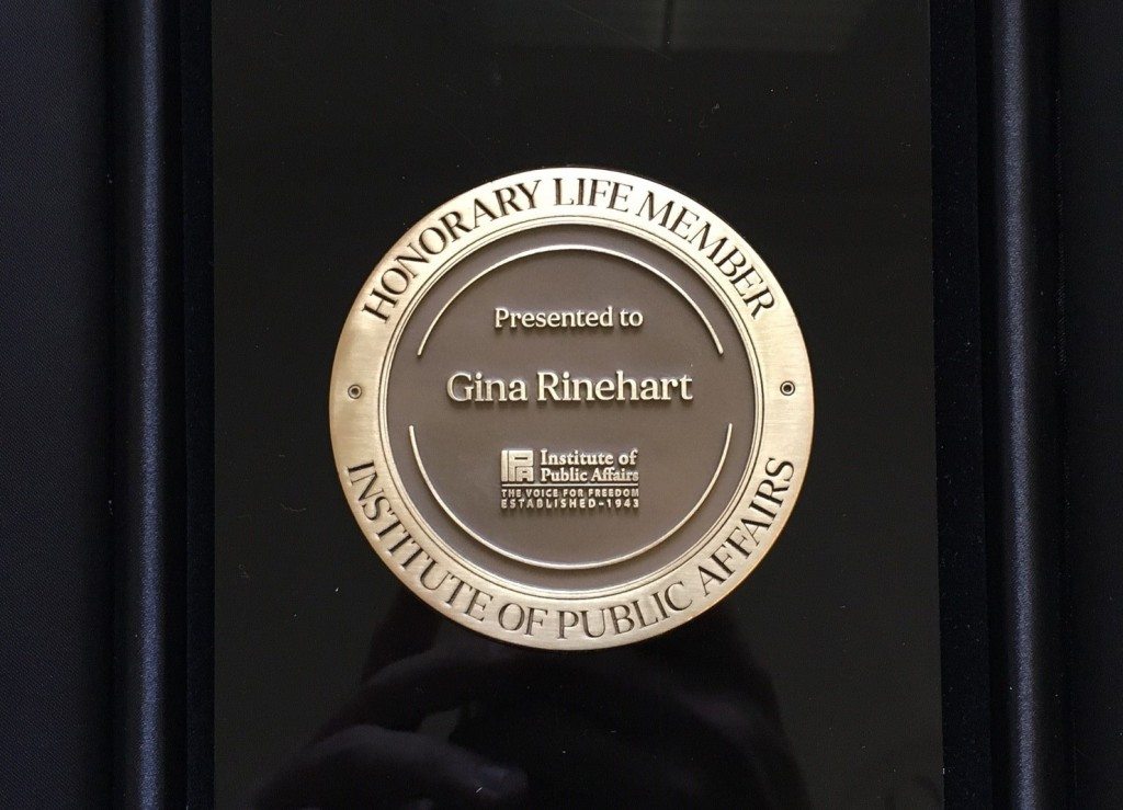 Mrs. Gina Rinehart was recently made an Honorary Life Member of the Institute of Public Affairs (IPA) for her lifetime contribution to Australia during a ceremony in Melbourne on November 23rd.