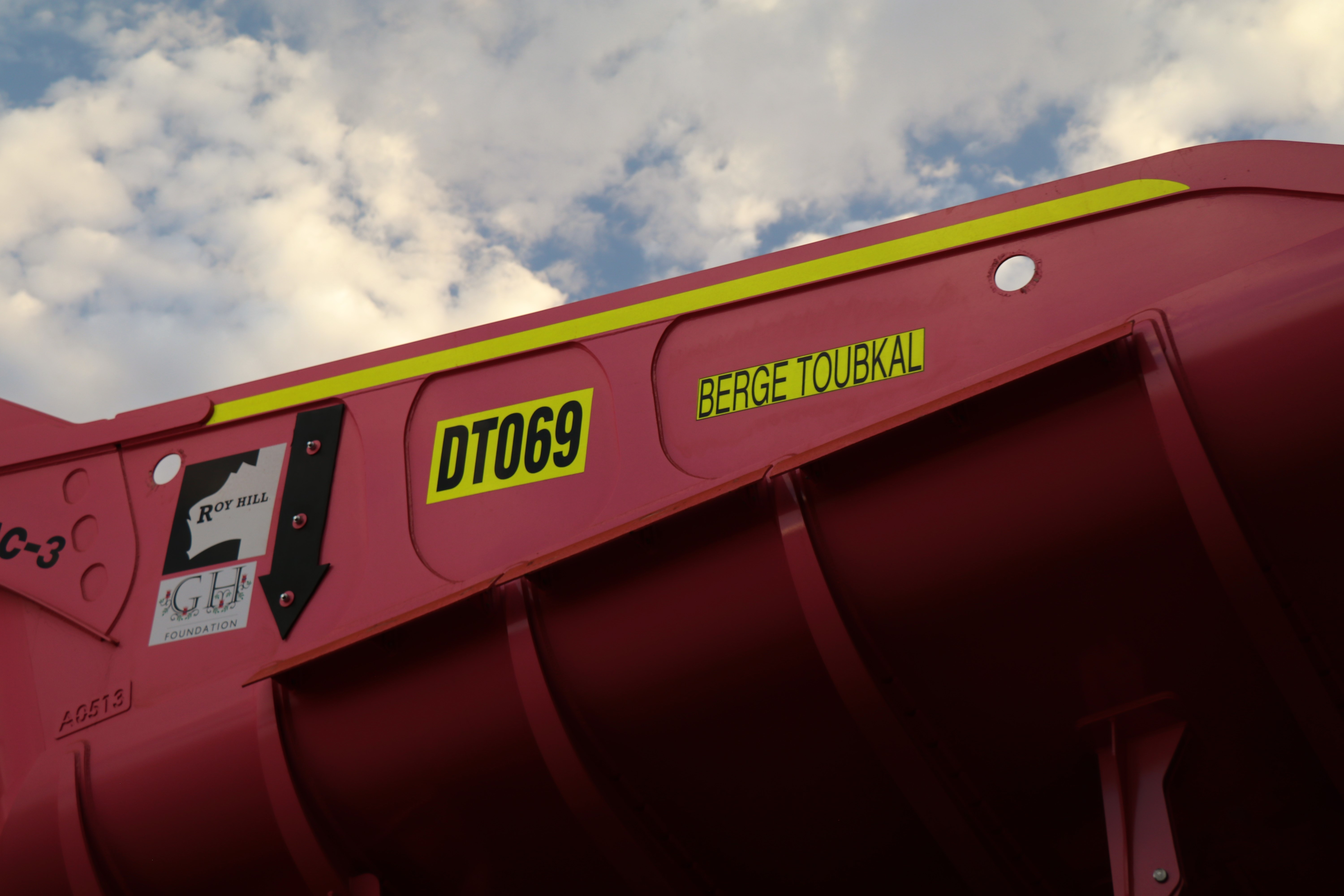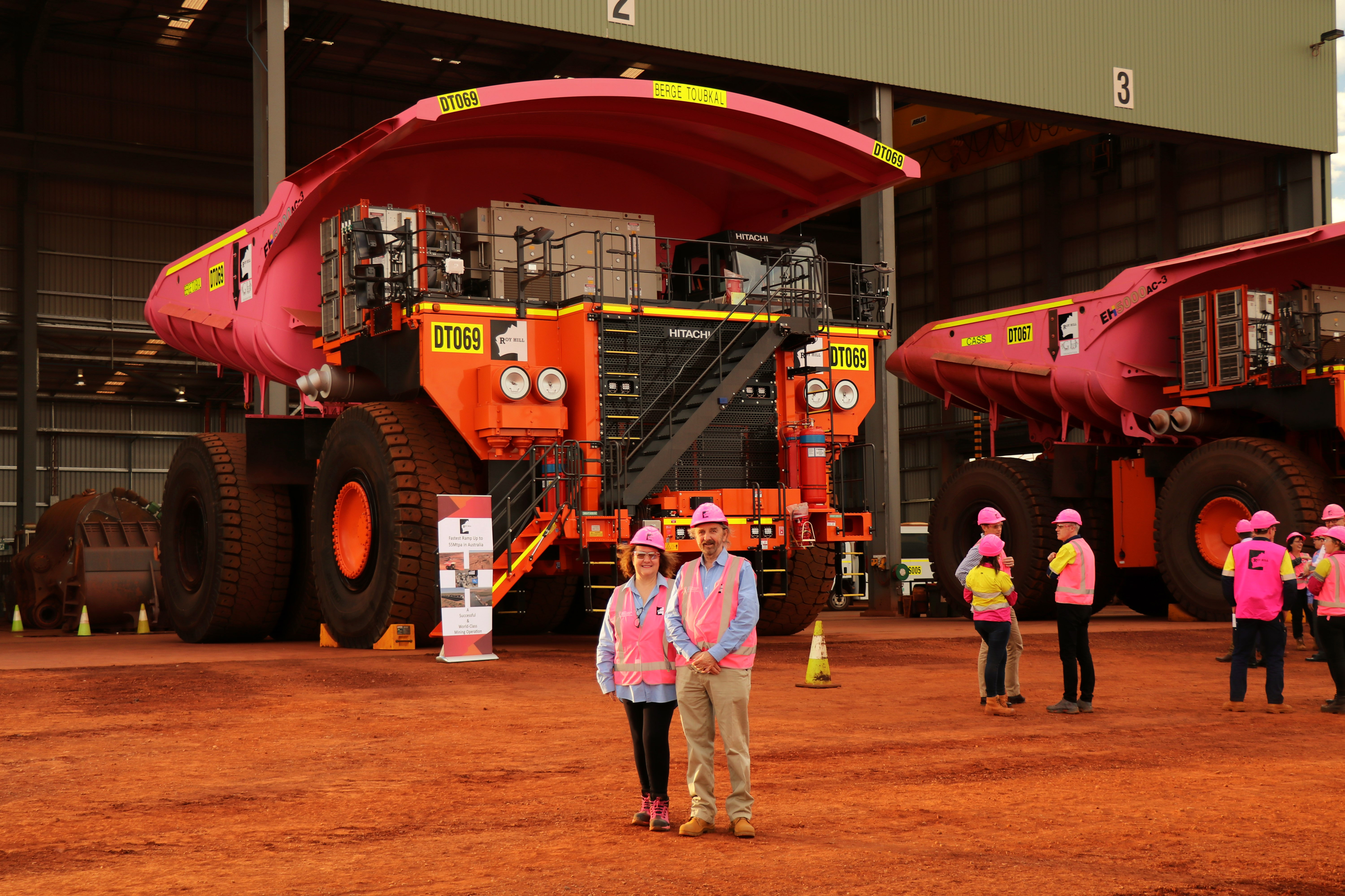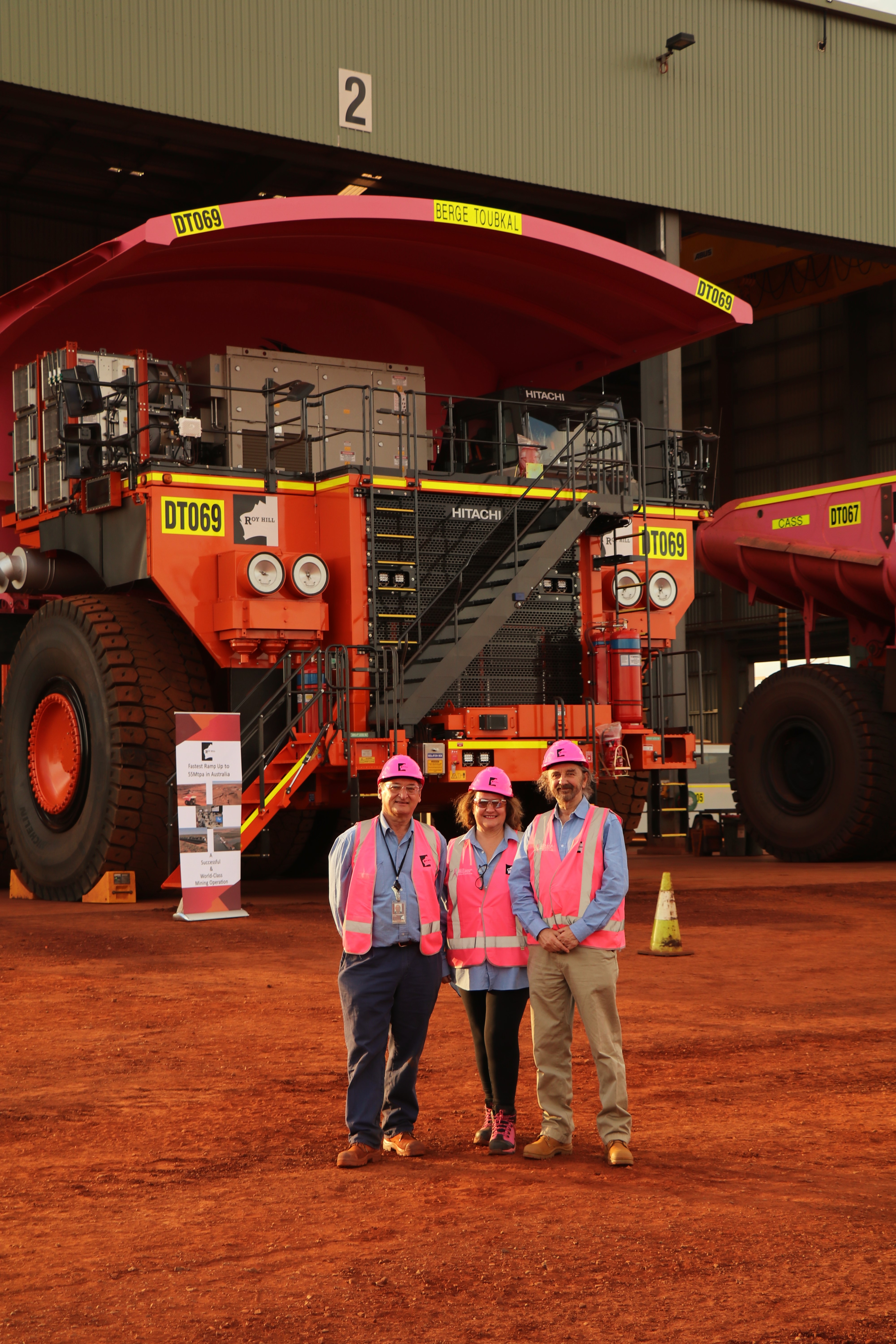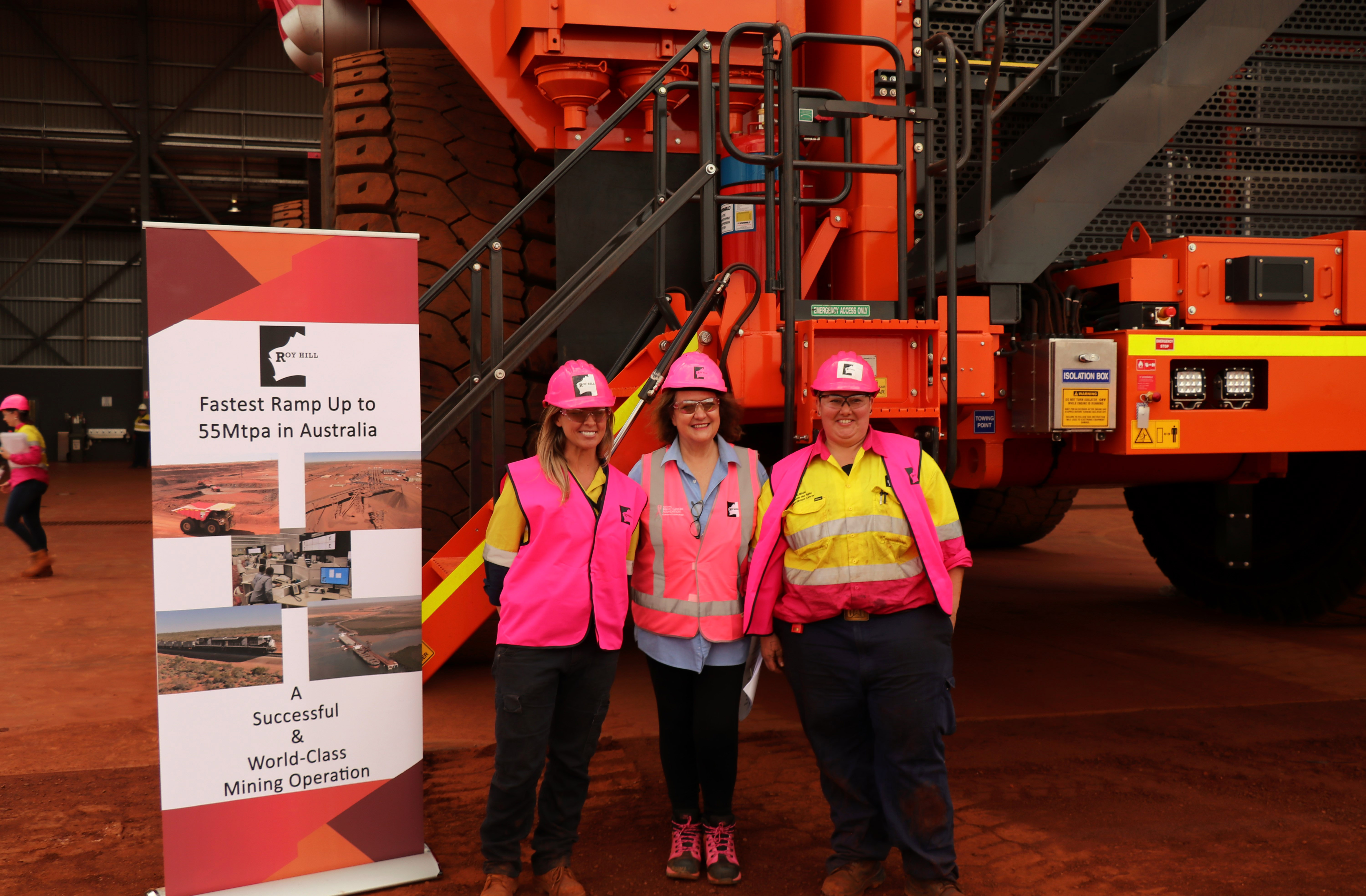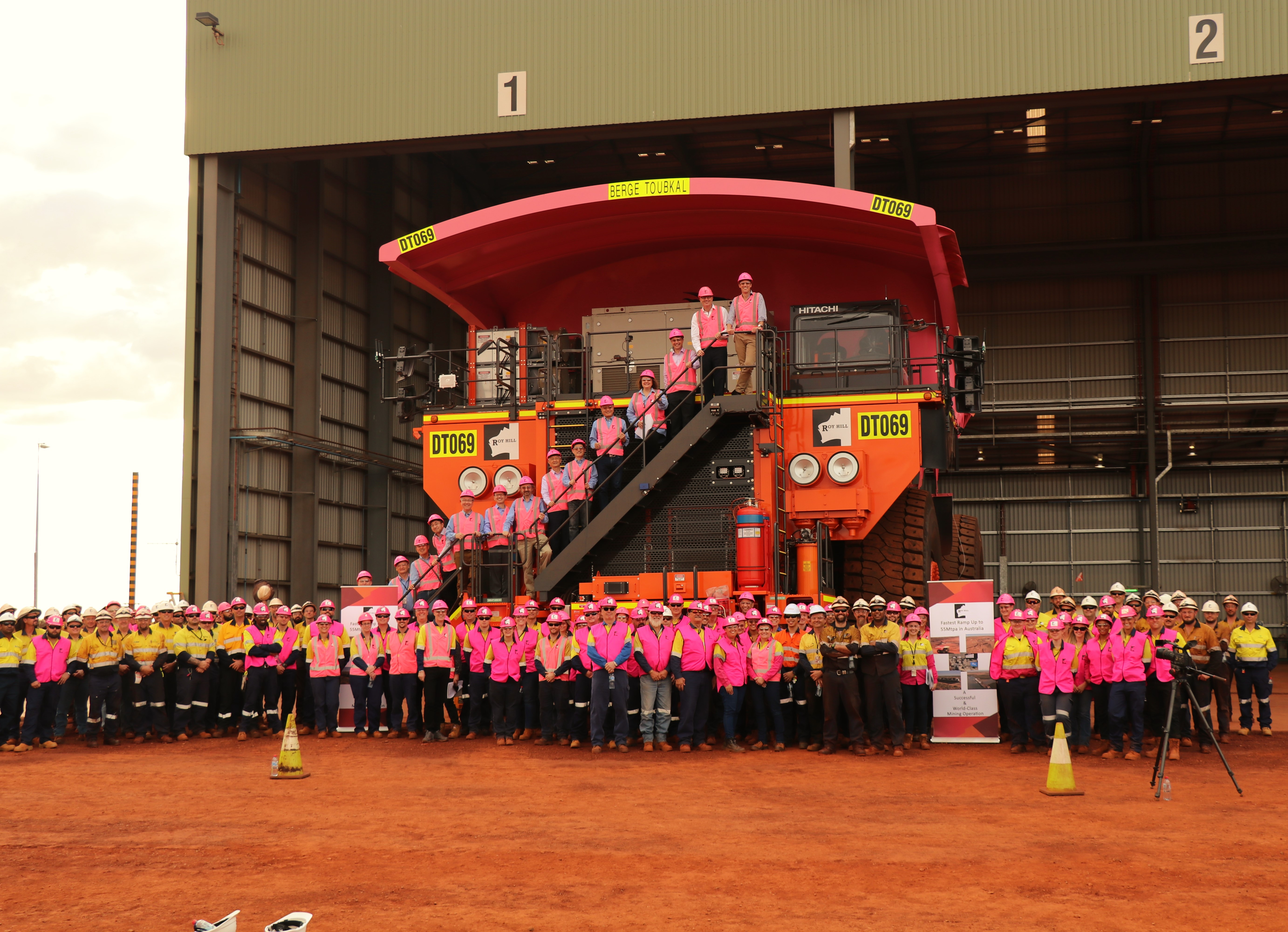 The first pink truck christened was ‘Berge Toubkal’, named after a 210,000 DWT Newcastlemax ship, currently visiting Port Hedland. Mrs Rinehart was honoured to be made Godmother of this ship at a ceremony in China last year and this ship carries Roy Hill’s iron ore to ports around the world. We were delighted that James Marshall, CEO of Berge Bulk and Duncan Bond, CCO of Berge Bulk, were with us to christen and launch a truck with the Berge Toubkal name on it. The Berge Toubkal is the largest ship to be berthed at Port Hedland for Roy Hill ore.